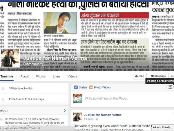 नमन के दोस्त इस पेज पर हर उस मीडिया लिंक को शेयर कर रहे हैं जिसमें नमन की हत्या की खबर को कवर किया गया है। ऐसे में देखने वाली बात यह है कि सोशल मीडिया की ताकत के आगे पुलिस किस तरह से अपना काम करने का रवैया बदलती है और नमन के हत्यारों को जल्द से जल्द पकड़ने की कोशिश करती है।