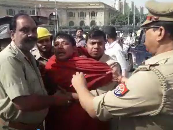 Lucknow news, लखनऊ। राजधानी लखनऊ में सोमवार को एक शख्स ने विधानसभा के सामने हंगामा खड़ा कर दिया। दरअसल, यह शख्स विधानसभा के सामने पहुंचा और माइक लेकर कार पर चढ़कर आत्महत्या करने की धमकी देने लगा। यह देख वहां मौजूद पुलिकर्मियों ने उसे रोकना चाहा तो उसने खुद पर पेट्रोल डाल लिया, जिसके बाद उसे पकड़ लिया गया। वह यही चिल्लाता रहा कि उसने हारकर यह कदम उठाया है, उसकी लड़ाई पीएम मोदी से है।