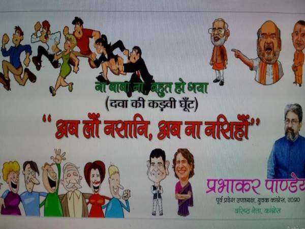 ये पोस्टर हजरतगंज चौराहे पर लगाया गया है जिसे कांग्रेस नेता प्रभाकर पांडेय की तरफ से लगाया गया है। इस पोस्टर में तुलसीदास की कविता की पंक्ति भी लिखी है, जिसके माध्यम से ये दर्शाने की कोशिश की गई है कि अब लोग नरेंद्र मोदी और अमित शाह से ऊब चुके हैं और उनको नई उम्मीद प्रिंयका और राहुल गांधी में दिख रही है।