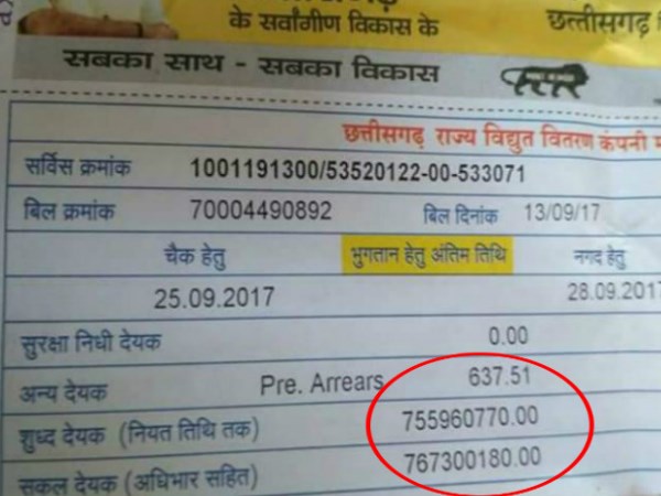 रामप्रसाद साहू को बिजली का बिल बांटने वाला महीने के अंत में बिल थमा गया। जब रामप्रसाद ने बिल देखा तो उनके होश उड़ गए। वह पहले समझ ही नहीं पाए कि उनका कितना बिल आया है। रामप्रसाद के बीपी क्रमांक 1001191300 में अगस्त के बिल में 75 करोड़ 59 लाख 60 हजार 765 रुपए का बिल तैयार किया गया। 13 सितंबर को बिल जारी हुआ और प्रिंट हुआ।