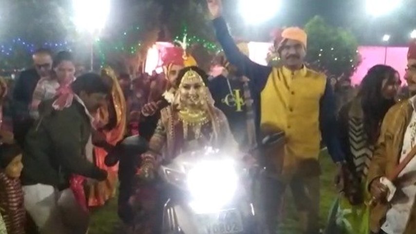 दरअसल, नीमच निवासी बालमुकन्द की बेटी नीलू दमामी की शादी ग्राम ढाकनी मनासा के अर्जुन पिता कैलाश के साथ हुई। दूल्हे के साथ स्टेज पर बैठने और फिर साथ फेरे लेने के लिए दुल्हन नीलू अपने घर से विवाह स्थल कल्याणेश्वर मंदिर सिटी रोड तक एक्टिवा पर सवार होकर गई।