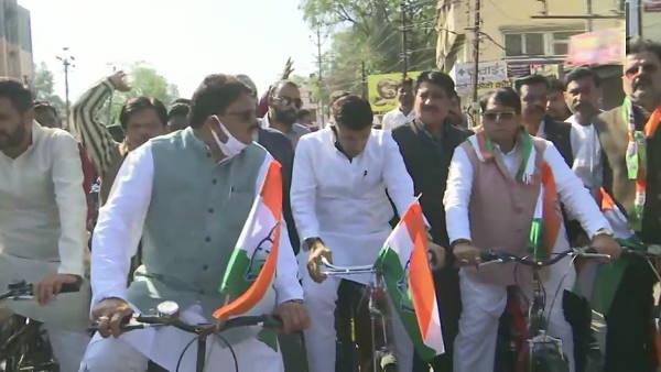 भोपाल। पेट्रोल-डीजल की बढ़ती कीमतों के विरोध में मध्य प्रदेश के कांग्रेस नेताओं ने सत्तारूढ़ भाजपा को जमकर कोसा। आज महंगाई को लेकर कांग्रेस के कार्यकर्ताओं ने अपने नेताओं की अगुवाई में साइकिल मार्च भी किया। न्यूज एजेंसी द्वारा बताया गया कि, मध्य प्रदेश विधानसभा में कांग्रेस नेता पीसी शर्मा, जीतू पटवारी और कुणाल चौधरी ने साइकिल की सवारी की। कांग्रेस के नेता खुद साइकिल चलाते देखे गए। उनके साथ ही उनके समर्थक भी सड़कों पर थे।