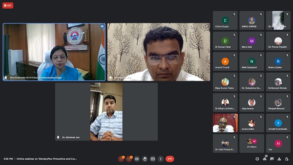 डॉ भूपेंद्र रोहित, सामुदायिक चिकित्सा विभाग ने इस बीमारी के खिलाफ निवारक और उपचारात्मक उपायों के बारे में विस्तार से बताया। उन्होंने शारीरिक संपर्क, मौखिक और नाक की बूंदों और खुले त्वचा के घावों और यौन संबंधों जैसे संचरण के प्रत्यक्ष और अप्रत्यक्ष माध्यमों जिनसे बीमारी फैल सकती है जानकारी दी। उन्होंने एहतियात के तौर पर कोविड की तरह सोशल डिस्टेंसिंग और मास्क की सलाह दी। डॉ रोहित ने मंकीपॉक्स के रोगियों के लिए अस्पताल में भर्ती होने से पहले के उपायों, शारीरिक संपर्क, अलगाव, सहायक प्रबंधन और दवाओं के बारे में बताया। डॉ अभिषेक कुमार जैन, विश्वविद्यालय स्वास्थ्य केंद्र के वरिष्ठ चिकित्सा अधिकारी ने सत्र का संचालन किया। सत्र के बाद प्रतिभागियों के साथ बातचीत हुई। डॉ आरटी बेद्रे, निदेशक यूजीसी-एचआरडीसी विश्वविद्यालय भी वेबीनार में शामिल हुए थे।