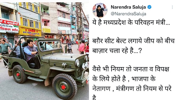 मप्र कांग्रेस में मीडिया कोऑर्डिटेनर नरेंद्र सलूजा ने देर रात एक ट्वीट कर मंत्री राजपूत का भरे बाजार जीप चलाते हुए वीडियो डालकर लिखा, ये हैं मप्र के परिवहन मंत्री...बगैर सीट बेल्ट लगाए जीप को बीच बाजार चल रहे हैं...? वैसे भी नियम तो जनता व विपक्ष के लिए होते हैं, भाजपा के नेतागण, मंत्रीगण तो नियम से परे हैं..!