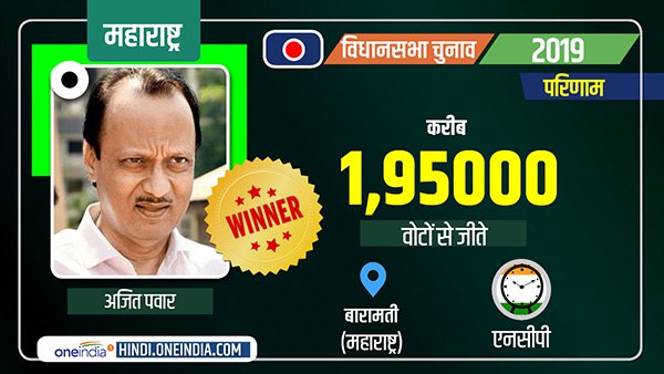 महाराष्ट्र के पूर्व डिप्टी सीएम रहे 193505 वोट्स हासिल हुए। उनके प्रतिद्वदीं गोपीचंद को सिर्फ 11 प्रतिशत वोट ही मिल सके। यहां पर 21 अक्टूबर को वोट डाले गए थे। गोपीचंद को सिर्फ 1414 वोट ही हासिल हुए हैं। बारामती, महाराष्ट्र का वह शहर है जहां की विधानसभा सीट पर हमेशा से पवार फैमिली की बादशाहत रही है। पहले इस सीट का प्रतिनिधित्व शरद पवार करते थे, बाद में साल 1991 से अजित पवार लगातार इस सीट से जीतते रहे हैं। बारामती विधानसभा सीट से शरद पवार 27 वर्षों तक(1967-1990) विधायक रहे। जब 1991 में शरद पवार नरसिम्हा राव सरकार में रक्षा मंत्री बने तो फिर उनके भतीजे अजीत पवार इस सीट से विधायक हुए। बारामती खेती-किसानी के लिए मशहूर है। पवार छह बार इस सीट से जीत चुके हैं। यह शहर करहा नदी के तट पर स्थित है। करहा नदी की वजह से इसके दो हिस्से हुए हैं। बारामती, गन्ने और अंगूर की पैदावार के लिए मशहूर है। यहां से शक्कर और अंगूर पूरे यूरोप में भेजे जाते हैं।