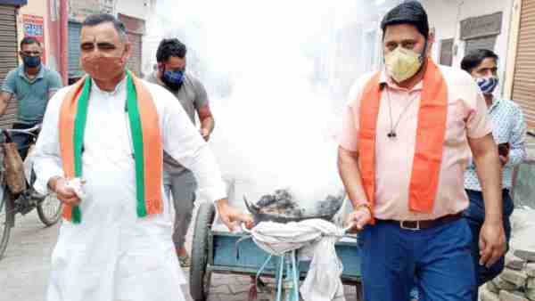 ठेले पर हवन का धुआं लेकर शंख बजाते हुए मेरठ की गलियों में घूमे भाजपा नेता, कहा- भागेगा कोरोना