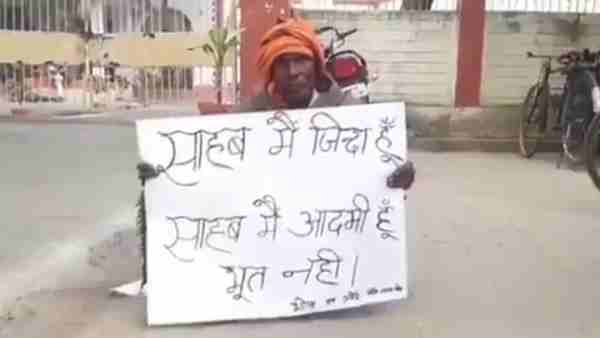 भोला सिंह, उत्तर प्रदेश के मिर्जापुर जिले के निवासी है और सिटी ब्लॉक में रहते है। वो पिछले 15 साल से खुद को जिंदा साबित करने के लिए अधिकारियों की चौखट पर चक्कर काटते-काटते थक चुके हैं। लेकिन उनकी कोई सुनवाई नहीं हो रही है। तो वहीं, अब वो एक तख्ती लेकर बैठे हैं, जिस पर लिखा है, 'साहब मैं जिंदा हूं, आदमी हूं भूत नहीं।'