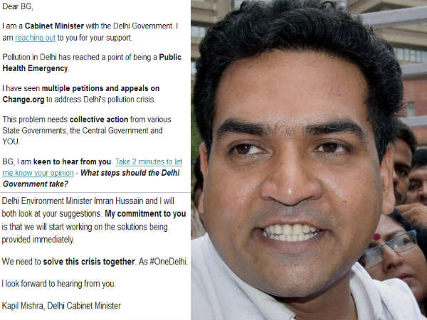 मंत्री कपिल मिश्रा ने Change.org के माध्यम से दो जरूरी सुझाव मांगे हैं जिसपर काम कर दिल्ली को प्रदूषण की समस्या से बचाया जा सके। कपिल मिश्रा ने ई-मेल में लिखा है कि दिल्ली के पर्यावरण मंत्री इमरान हुसैन के साथ मिलकर वो इन सुझावों पर फौरन एक्शन लेंगे। आपको बता दें कि दिल्ली के मुख्यमंत्री अरविंद केजरीवाल ने प्रदूषण पर लगाम के लिए एक प्लान बनाया है जिसके तहत कुछ दिशानिर्देश जारी किए गए हैं।