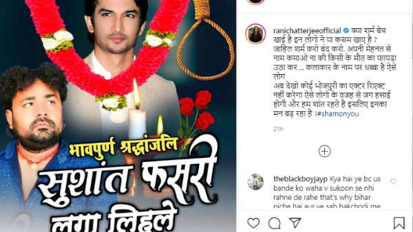 एक्ट्रेस रानी चैटर्जी ने हाल ही में अपने ऑफीशियल इंस्टाग्राम अकाउंट पर एक फोटो शेयर की है, फोटो में स्पष्ट रूप से दिख रहा है कि एक भोजपुरी सिंगर ने सुशांत सिंह राजपूत के निधन पर सैड सॉन्ग बना दिया है। इसे देखकर रानी को बहुत गुस्सा आया उन्होंने इस तस्वीर के कैप्शन में उन्होंने ऐसा करने वाले शख्स को जमकर लताड़ लगा डाली है।