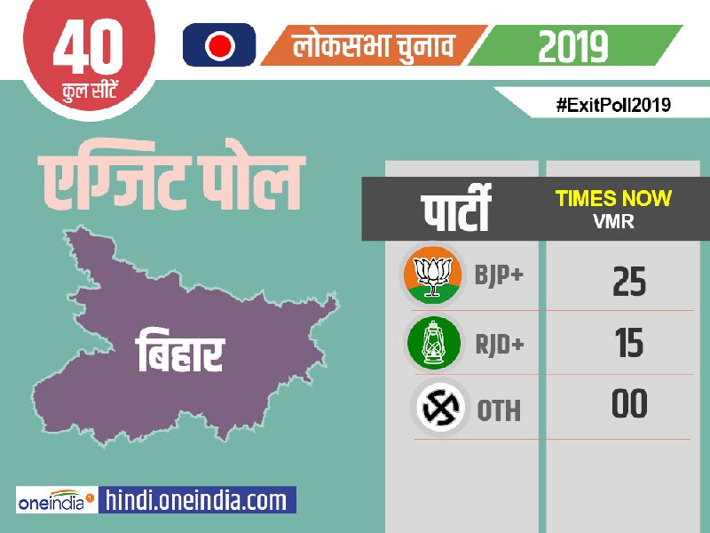 बिहार। सातवें चरण की वोटिंग के साथ ही लोकसभा चुनाव 2019 संपन्न हो गया है। टाइम्स नाउ वीएमआर के मुताबिक, 40 सीटों वाले बिहार में एनडीए की सीटें घट सकती हैं। महागठबंधन को पिछले चुनाव की तुलना में सीधे तौर पर 5 सीटों का फायदा होता दिख रहा है। एग्जिट पोल के मुताबिक, बिहार में इस बार बीजेपी गठबंधन को कुल 25 सीटें और महागठबंधन को कुल 15 सीटें मिलती दिख रही हैं।