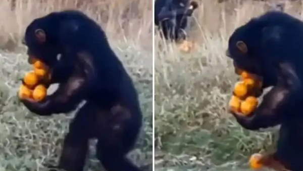 चिम्पैंजी का फल ले जाने का तरीका हुआ सोशल मीडिया पर वायरल, लोगों ने कहा- लालची बंदर