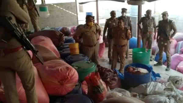 ये मामला हथिगवां थाना क्षेत्र के कंधई का पुरवा मोहद्दीनगर का है। एएसपी पश्चिमी दिनेश चंद्र द्विवेदी ने मीडिया को जानकारी देते हुए बताया कि गांव के राहुल यादव के घर से हिमाचल की बनी अवैध शराब की 211 पेटियां बरामद हुई है। इसी घर से कुछ दूर पर भारत लाल के मकान से ड्रम में भरी 205 लीटर स्प्रिट, एक लाख 30 हजार ढक्कन, 40 हजार खाली बोतल, एक लाख 25 हजार रैपर, बार कोड वाले 248 रोल, दो रोल टेप, 90 पेटियां खाली गत्ते, चार बोतल एसेंस यानी रंगीन शराब बनाने वाला केमिकल, दो ढक्कन पंच मशीन, पांच खाली ड्रम व एक मैजिक गाड़ी बरामद हुई। वहीं, शराब माफिया गुड्डू सिंह के फार्महाउस में गौशाला की आड़ में शराब बनाने का गोरखधंधा चल रहा था.