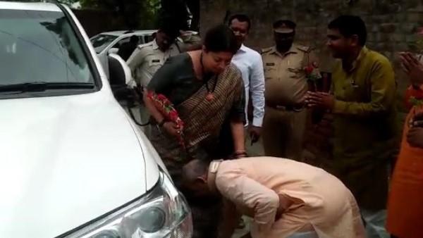 VIDEO: जब उम्र में काफी बड़े भाजपा विधायक ने छुए स्मृति ईरानी के पैर