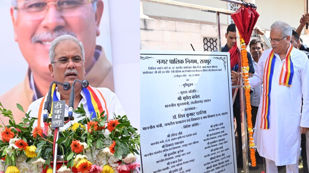 RAIPUR: मुख्यमंत्री भूपेश बघेल शनिवार को राजधानी रायपुर स्थित अम्बेडकर चौक में आयोजित भीमराव अम्बेडकर की प्रतिमा स्थापना और भूमिपूजन कार्यक्रम में शामिल हुए। इस अवसर पर कांग्रेस विधायक कुलदीप जुनेजा, महापौर एजाज ढेबर, छत्तीसगढ़ योग आयोग के अध्यक्ष ज्ञानेश शर्मा समेत कई जनप्रतिनिधि उपस्थित थे ।