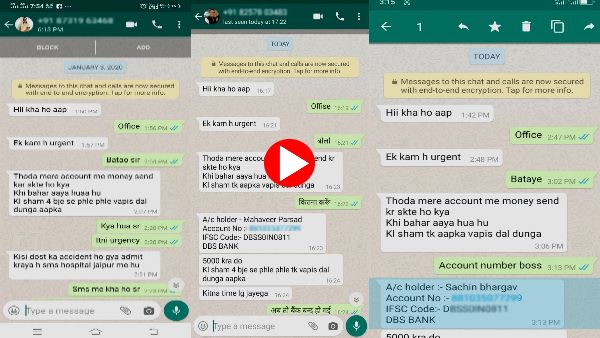सचिन भार्गव ने कमांडो नरेश मीणा से रुपए जमा करवाने के संबंध में बात की तो पता चला कि नरेश के पास व्हाट्सएप पर अनजान नंबर से मैसेज आया था। व्हाट्सएप पर डीपी सचिन भार्गव की लगी हुई थी। उसने मैसेज किया कि वो बाहर है उसे रुपए की सख्त जरूरत है। जरूरत के संबंध में पूछने पर बताया कि एक दोस्त का एक्सीडेंट हो गया। उसका एसएमएस अस्पताल जयपुर में इलाज के लिए रुपए चाहिए। शाम पांच बजे वापस कर देगा। मदद की सोचकर कमांडो नरेश ने उसके खाते में पांच हजार रुपए डलवा दिए।