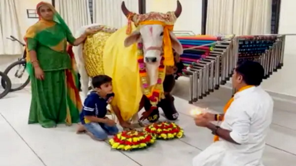 बिजनेसमैन का पूरा परिवार गाय राधा की आरत उतारता है