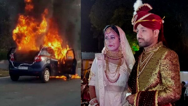 Bhilwara : घर लौट रहे दूल्हा-दुल्हन की कार में लगी आग, टायर फटने पर जोरदार धमाका, VIDEO