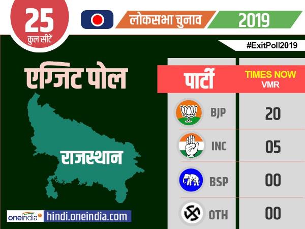 टाइम्स नाउ-वीएमआर सर्वे के एग्जिट पोल में अनुमान लगाया गया है कि राजस्थान की 25 में से 20 सीटें भाजपा को मिल सकती हैं, वहीं कांग्रेस के खाते में 5 सीट जा सकती हैं। बसपा व निर्दलीय प्रत्याशियों के जीतने की संभावना ना के बराबर है। एग्जिट पोल के नतीजे सच साबित होते हैं या नहीं। इसका पता तो 23 मई को मतगणना के बाद ही चल सकेगा।