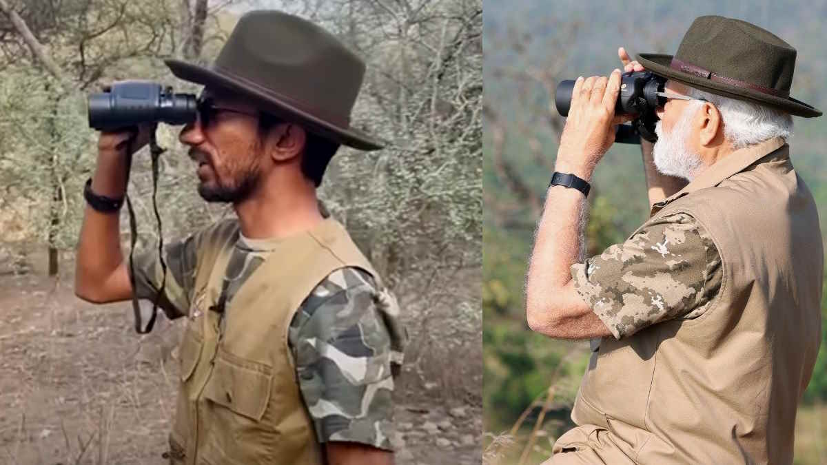 पीएम मोदी जंगल सफारी के दौरान खाकी पेंट के साथ प्रिंटेंड टी शर्ट पहन रखी थी। उन्हीं से मिलते जुलते कपड़े पहनकर श्याम रंगीला ने वीडियो शूट करवाया।