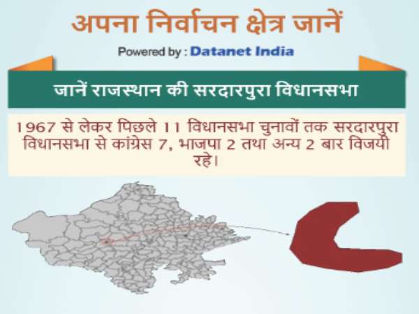सरदारपुरा विधानसभा सीट से जुड़ी बातों पर नजर डाले तो 1967 से लेकर पिछले 11 विधानसभा चुनाव तक सरदारपुरा विधानसभा से कांग्रेस ने 7, भाजपा 2 व अन्य पार्टियों को 2 बार जीत मिली है। यहां की कुल जनसंख्या 3,54,684 है। यह पूरी तरह से शहरी सीट है। इस सीट में आने वाले 93 प्रतिशत हिन्दू हैं जबकि 5 प्रतिशत मुस्लिम हैं। सामाजिक समूह की बात करें तो अनुसूचित जाति 16.13 प्रतिशत है और अनुसूचित जनजाति 2.14 प्रतिशत है। इसी सीट की साक्षरता दर 81 प्रतिशत है।
