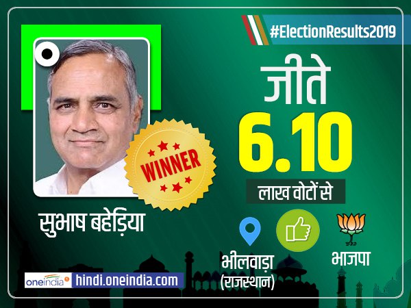 Bhilwara Lok Sabha Seat result 2019, भीलवाड़ा। लोकसभा चुनाव 2019 की मतगणना में राजस्थान में पहला नतीजा आ गया है और उसने इतिहास भी रच दिया है। पहली जीत का सेहरा भीलवाड़ा लोकसभा सीट से भाजपा प्रत्याशी सुभाष बहेड़िया के सिर बंधा है। राजस्थान के भीलवाड़ा लोकसभा सीट से सुभाष बहेड़िया ने ऐतिहासिक जीत दर्ज की है। सबसे बड़ी जीत के मामले में सुभाश चन्द्र बहेड़िया ने पीएम मोदी को भी पीछे छोड़ दिया है।