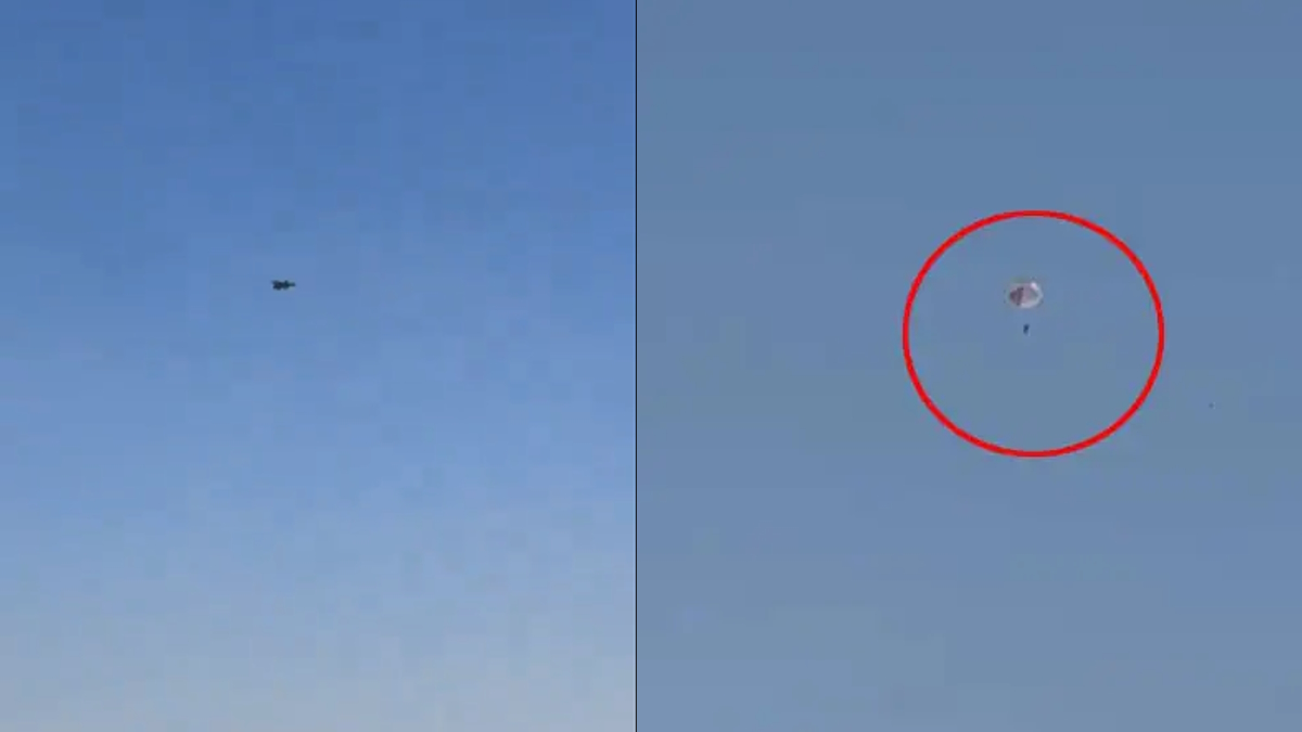 पायलट के जेट से बाहर निकलने के वीडियो में देखा जा सकता है कि फाइटर जेट कम ऊंचाई पर उड़ान भरते हुए तेजी से नीचे आ रहा है। जेट कैमरे के फ्रेम में दाएं से बाएं ग्लाइड करता है और पायलट पैराशूट खोलता है और जमीन की ओर उतरता है।