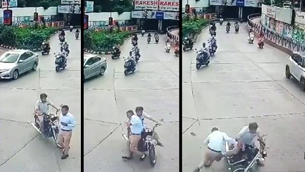 सड़क पार करते हुए मोबाइल देख रहा था PSI, बिना हेलमेट वाले बाइकर ने ठोका, वीडियो वायरल