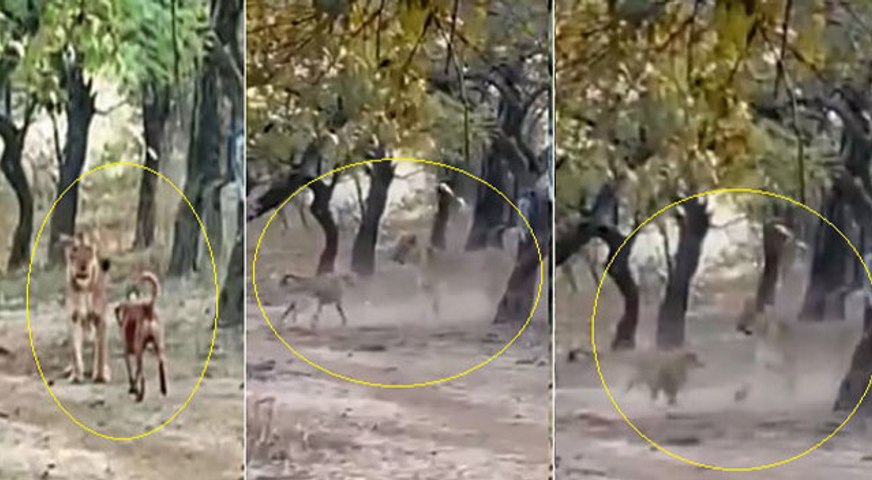 जंगल में कुत्ते ने शेरनी को धूल चटाई