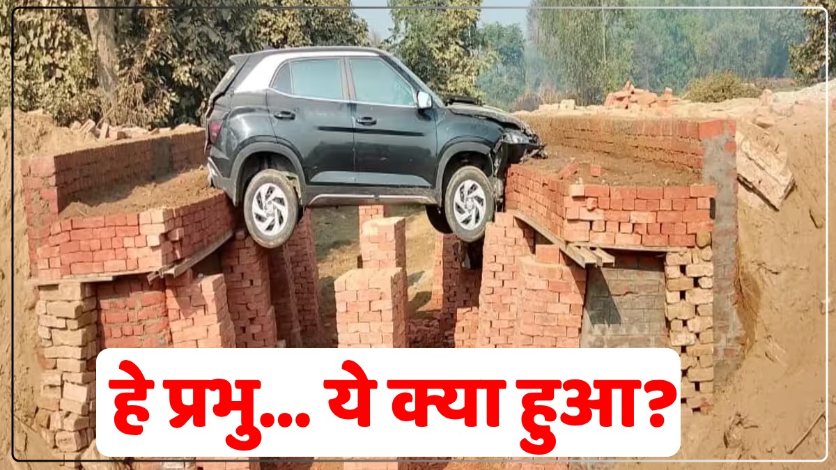 हे प्रभु..., निर्माणाधीन पुलिया पर लटक गई कार, सोशल मीडिया पर वीडियो वायरल, जानिए पूरा मामला