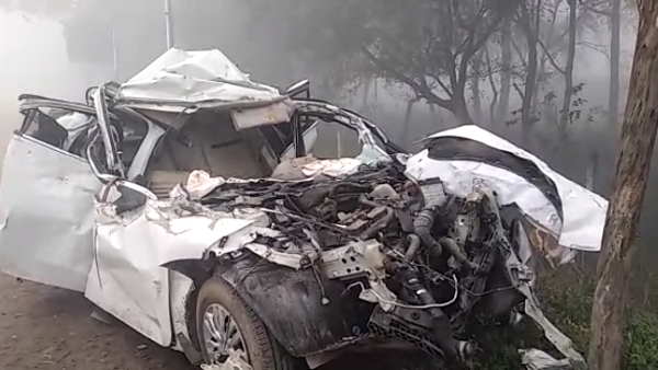 कार ने ट्रक में मारी टक्कर तभी पीछे से आ रहे दूसरे ट्रक ने कार को रौंद डाला, तीन लोगों की मौत