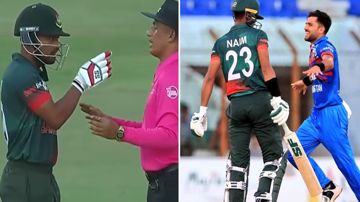 शांटो और फारुकी में टक्कर: अफगानिस्तान के तेज गेंदबाज फजलहक फारूकी और बांग्लादेशी बल्लेबाज नजमुल हुसैन शांटो के बीच मैदान पर तकरार देखने को मिली। दरअसल, फजलहक फारूकी की गेंद पर शांटो बिट हो गए। जिसके बाद उन्होंने गेंदबाज को आंखें दिखाते हुए कुछ कहा। फिर गेंदबाज भी बल्लेबाज की तरफ बढ़ने लगा, लेकिन बीच में अंपायर ने आकर मामले को संभाल लिया।