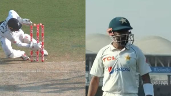 वह सलमान आघा के साथ क्रीज पर थे। पारी के 59वें ओवर में बाबर आज़म को रन आउट होकर जाना पड़ा। नए खिलाड़ी रेहान अहमद की गेंद पर सलमान ने मिडविकेट की तरफ शॉट खेला और रन के लिए दौड़े। इसके बाद सलमान रुके और फिर से दौड़ पड़े। बाबर आज़म अपनी क्रीज से निकल गए थे और उनके लिए रुकना मुश्किल था। फील्डर हैरी ब्रूक चीते की तरह गेंद पर टूट पड़े और उसे पकड़कर विकेटकीपर बेन फॉक्स की तरफ फेंका। बेन फॉक्स के एक हाथ से स्टंप्स बेल गिर गई लेकिन उन्होंने डाइव लगाकर दूसरे हाथ से गेंद पकड़कर एक बेल गिरा दी। इस तरह थर्ड अम्पायर के पास मामला गया और बाबर आज़म रन आउट होकर चले गए। पवेलियन जाते समय बाबर कुछ कह रहे थे और नाराज़ दिख रहे थे।