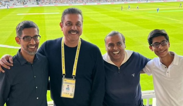 शास्त्री ने अपने आधिकारिक ट्विटर हैंडल पर दोनों हस्तियों के साथ खेल देखने की तस्वीर पोस्ट की थी और उन्होंने लिखा, "दो लोगों की शानदार कंपनी में जो अपने क्रिकेट से प्यार करते हैं- मुकेश अंबानी और सुंदरपिचाई