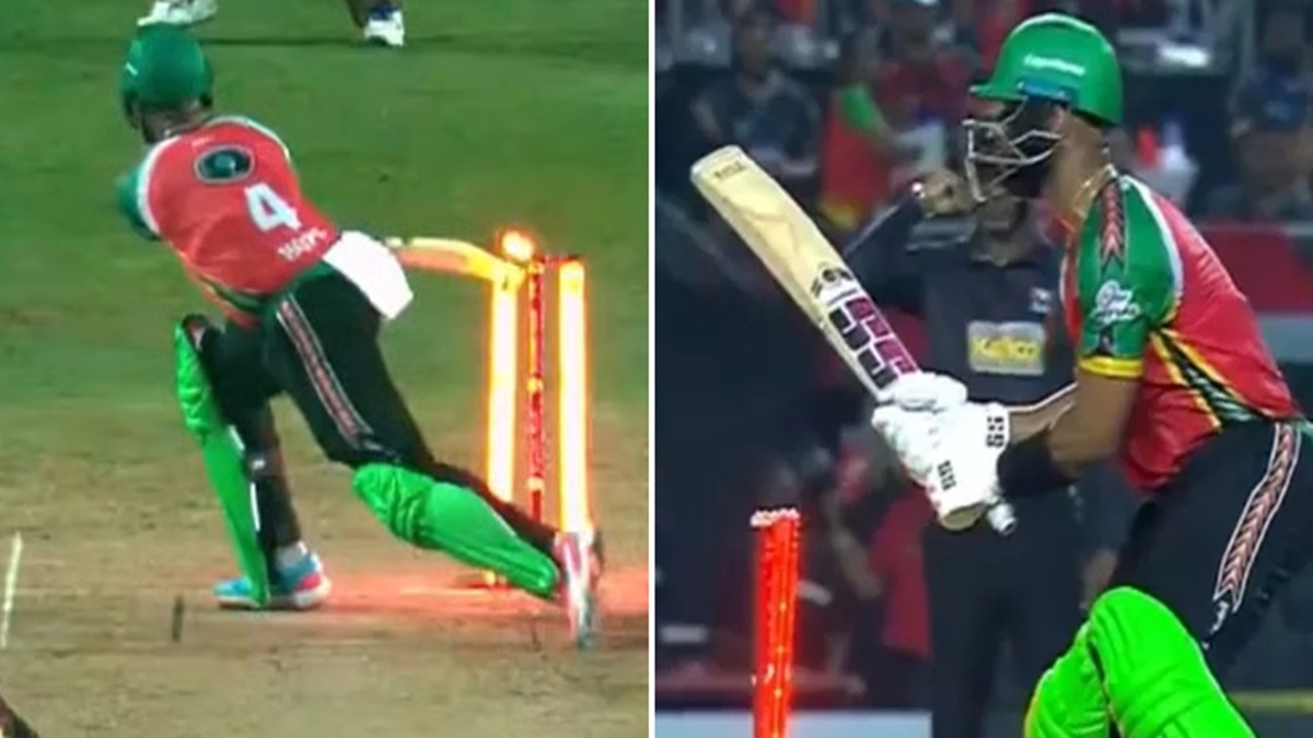 गयाना की ओर से खेल रहे शाई होप उस समय 28 गेंदों पर 39 रन बनाकर क्रीज पर जमे हुए थे। सबकुछ सामान्य लग रहा था, लेकिन फिर हुआ कुछ ऐसा जिसने सभी को चौंका दिया। त्रिनबागो के गेंदबाज़ टेरेंस हाइंड्स की गेंद ऑफ स्टंप से काफी बाहर थी। होप ने सोचा कि क्यों न एक स्टाइलिश शॉट खेला जाए। उन्होंने रिवर्स रैंप शॉट लगाने की कोशिश की, लेकिन इसी दौरान उनका बैलेंस बिगड़ गया। शॉट लगाते-लगाते उनके बैट का निचला हिस्सा स्टंप्स से टकरा गया और बेल्स जमीन पर गिर गईं।