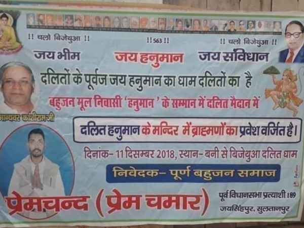 सुल्तानपुर। राजस्थान विधानसभा चुनाव प्रचार के दौरान उत्तर प्रदेश के मुख्यमंत्री योगी आदित्यनाथ ने जिस तरह से हनुमान को दलित बताया, उसको लेकर अब पोस्टरवार शुरू हो गया है। सुल्तानपुर में दलितों ने रामायण काल में कालनेमि राक्षस के वधस्थल प्राचीनतम बिजेथुआ धाम मंदिर पर दावा ठोंक दिया है। दलितों ने मंदिर पर पोस्टर लगाकर ब्राहमणों के मंदिर में प्रवेश पर रोक लगा दिया है। दलितों का कहना है कि हनुमान मंदिर हमारा है। यह दलित पुजारी अब पूजा-अर्चना करेंगे।