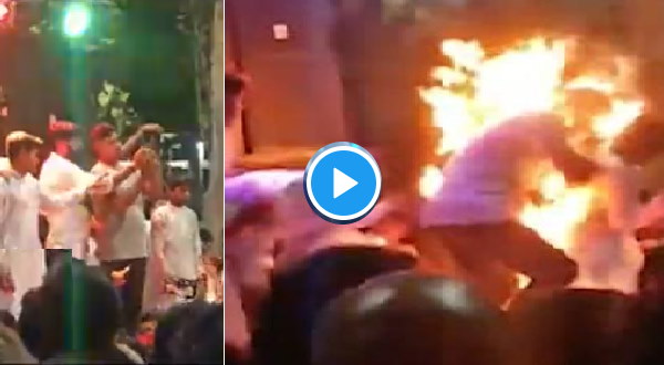 इस घटना का वीडियो सामने आया है। वीडियो में देखा जा सकता है कि पुरुषों का एक समूह आग वाले खतरनाक स्टंट के लिए तैयार हो रहा है। उसी दौरान वहां एक शख्स ने आग बुझाने के लिए अपने मुंह से एक ज्वलनशील पदार्थ बाहर निकाला, लेकिन खुद को ही आग लग गई। आग इतनी तेजी से फैली कि उसका पूरा शरीर जलने लगा। मंच भी आग की लपटों में घिर गया।