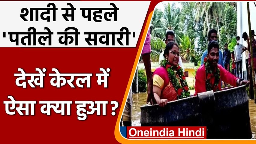 तिरुअनंतपुरम, 18 अक्टूबर: कोरोना के साथ-साथ केरल आसमानी आफत की भी बुरी तरह से सामना कर रहा है। पिछले तीन दिनों में राज्य में हुई भारी बारिश के बाद लैंडस्लाइड ने काफी कोहराम मचा रखा है। केरल से काफी डरा देने वाली तबाही की तस्वीरें सामने आ चुकी हैं। भारी बरसात, तबाही और परेशानी के बीच केरल से एक सुखद तस्वीर भी सामने आई है, जिसको देखकर आप भी खिल उठेंगे। जी हां, केरल में बाढ़ के बीच पतीले में बैठ दूल्हे-दुल्हन शादी के मंडप तक पहुंचे, जिसकी तस्वीरें सोशल मीडिया पर जमकर वायरल हो रही हैं।