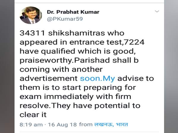 68500 टीचर भर्ती का रिजल्ट जारी होने के बाद असफल अभ्यर्थियों ने आयोग के विरुद्ध बखेड़ा खड़ा कर दिया है। इस बात के लिए लगातार आवाज उठाई जा रही है इस भर्ती के रिजल्ट में एक खास वर्ग के लोगों को फायदा दिया गया है। ऐसे में सबसे जरूरी था कि रिजल्ट की सुचिता लोगों के सामने रखी जाए और उसी के तहत अपर मुख्य सचिव ने खुद सामने आकर ट्वीट किया है और पूरी स्थिति साफ करते हुए कुल शिक्षामित्रों के पास होने की जानकारी दी है। जिससे अब विरोध में उठ रहे स्वर निश्चित तौर पर स्वतः ही शांत होते नजर आ रहे हैं।
