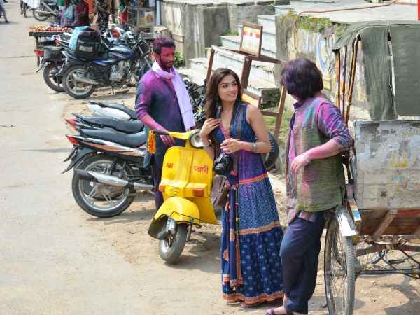 फिल्म के शॉट्स में गोविन्द नामदेव भारतीय एकता दल के नेता बलवंत पांडेय बने हैं जो चुनावी जुलूस को लेकर वहां से गुजरते है। सड़क किनारे पीले रंग की स्कूटर से शरमन जो इस फिल्म में काशी के नाम से पुकारे जाते हैं, टूरिस्ट गाइड का किरदार निभा रहे हैं।