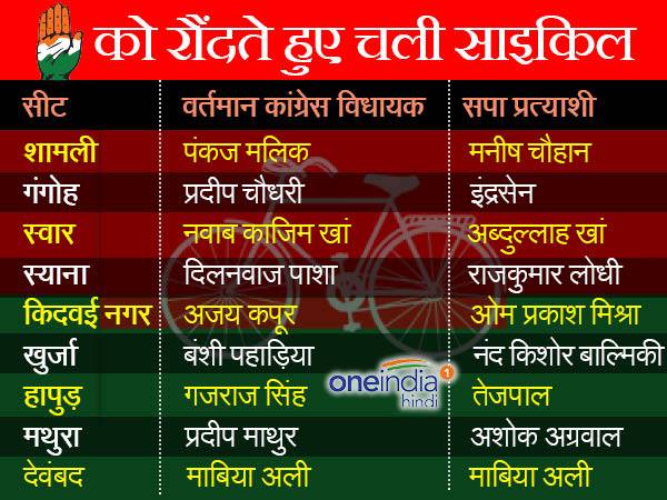 हापुड़ से कांग्रेस के गजराज सिंह ने सीट जीती थी, सपा ने यहां से तेजपाल को टिकट दिया है। मथुरा सीट कांग्रेस प्रदीप माथुर के पास है इस पर सपा ने अशोक अग्रवाल को टिकट दिया है। सपा के राजेंद्र राणा के निधन के बाद देवबंद विधानसभा सीट कांग्रेस के माविया अली ने जीती थी, माविया अब सीट पर सपा के उम्मीदवार हैं। साफ है कि 2012 में सपा की लहर के बावजूद जो नेता कांग्रेस के चुनाव निशान पर जीते उन्हें पार्टी किसी कीमत पर निराश नहीं करना चाहेगी, क्योंकि इससे पार्टी को ना सिर्फ इस चुनाव में बल्कि लोकसभा चुनाव में भी तगड़ा नुकसान उठाना पड़ सकता है।