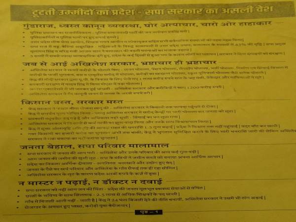पैम्फ्लेट के पहले पन्ने में भाजपा ने सपा सरकार और उसकी नाकामियों का जिक्र किया है। लिखा है कि सपा के शासनकाल में पुलिस प्रशासन का राजनीतिकरण हो गया है। पुलिस सपा की जन उत्पीड़न प्रकोष्ठ बन गई है। लिखा गया है कि इनके शासन में उत्तर प्रदेश लोक सेवा आयोग, शिक्षक चयन आयोग और लोकायुक्त सरीखी संस्थाओं को तहस-नहस कर दिया गया है। भाजपा के इस पैम्फ्लेट में कैबिनेट मंत्री आजम खान और सपा सुप्रीमो मुलायम सिंह यादव के बालात्कार पर दिए बयानों का जिक्र करते हुए लिखा गया है कि इन लोगों ने दुष्कर्म की बढ़ती घटनाओं का माखौल उड़ाया है।