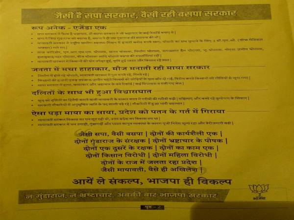 पैम्फ्लेट के दूसरे पन्ने पर बसपा जिक्र करते हुए लिखा गया है कि सपा और बसपा का रूप अनेक है लेकिन इनका एजेंडा एक ही है। इनके राज में कई घोटाले हुए हैं। लिखा है कि एक तरफ मायावती खुद को दलितों की बेटी बताती हैं लेकिन उन्होंने भी दलितों के साथ विश्वासघात किया है। उनके शासन काल में गरीबों की गरीबी बढ़ गई और महिलाएं बच्चे कुपोषण के शिकार हो हुए। लिखा है कि बसपा राज में गुंडागर्दी और धन उगाही के साथ-साथ कानून व्यवस्था खराब रही और पूंजी का निवेश जीरो रहा। हालांकि इस 2 पन्ने के पैम्फ्लेट में कांग्रेस या उसके शासन काल का कोई जिक्र नहीं है। ना ही राहुल गांधी की किसान यात्रा और नोटबंदी के दौरान उनके भाषणों का। ना ही भाजपा ने सरकार में आने के बाद अपनी किसी आगे की नीति का जिक्र किया है। ये भी पढे़ं: यूपी विधानसभा चुनाव 2017: अखिलेश बनाम मुलायम: बापू सेहत के लिए तू तो हानिकारक है