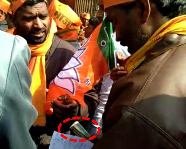 आचार संहिता की धज्जियां उड़ाते हुए भाजपा प्रत्याशी ने नॉमिनेशन में आनेवाले लोगों को पैसे बांटे। इस घटना का वीडियो सामने आया है।