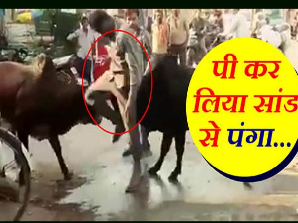 VIRAL VIDEO: जब दो सांडों की लड़ाई के बीच कूद पड़ा शराबी..