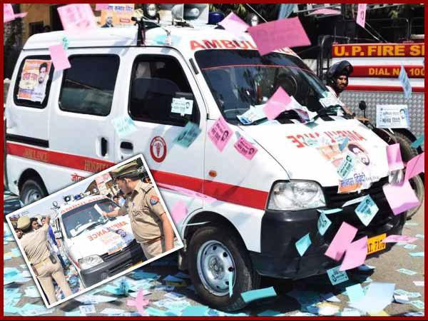 चुनावों में एंबुलेंस से नामांकन कराने पहुंचा प्रत्याशी, गाड़ी पर चिपकाए थे स्टीकर-पोस्टर भी