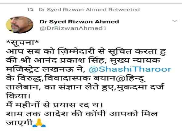 शशि थरूर ने बयान देते हुए कहा था कि 'बीजेपी द्वारा लिखा नया संविधान हिंदू राष्ट्र के सिद्धांतों पर आधारित होगा, जो अल्पसंख्यकों के समानता के अधिकार को खत्म कर देगा। जो देश को हिंदू पाकिस्तान बना देगा। उनके इस बयान को लेकर सैयद रिजवान अहमद ने कांग्रेस सासंद शशि थरूर के खिलाफ आरोप लगाया था। साथ ही घृणा फैलाने का आरोप लगाकर अर्जी भी दी थी। इसमें उन्होंने कहा कि 12 जुलाई 2018 को थरूर ने केरल के तिरुअनंतपुरम में सभा को संबोधित करते हुए घोर आपत्तिजनक बयान दिया था। उनकी इस अर्जी को स्वीकार करते हुए कोर्ट ने यह फैसला लिया है।