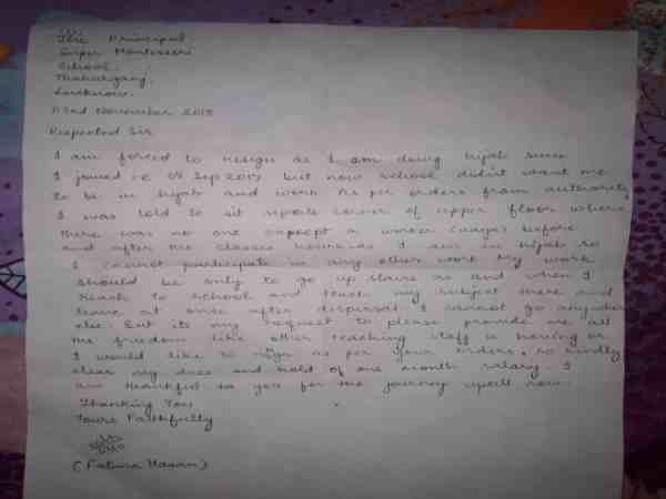 मामले में फातिमा का कहना है कि, "जब मैंने इसका विरोध किया तो मुझसे इस्तीफा मांगा गया। मैंने रिजाइन कर दिया और पत्र में इस बात का जिक्र किया की मुझसे जबरदस्ती पद छोड़ने के लिए कहा जा रहा है।"