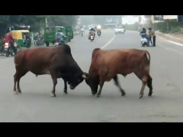 दो सांडों के बीच सड़क पर लड़ाई से आधे घंटे तक दहशत का माहौल रहा। इस बुल फाइट में दो राहगीर चोटिल भी हो गए। एक पान की गुमटी टूट गई और परचून की दुकान का सामान बर्बाद हो गया।