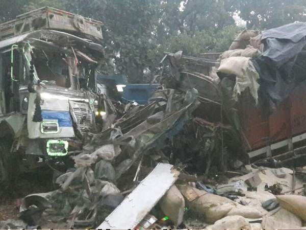 भीषण टक्कर से दो ट्रक हुए चकनाचूर, काटकर निकाली गई लाशें