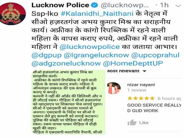 लखनऊ। यूपी की राजधानी लखनऊ की पुलिस अपने एक कार्य के चलते सुर्खियों में बनीं हुई है। एक अफ्रीकी महिला ने लखनऊ के एक कंपनी से ऑनलाइन कपड़े आर्डर किए थे। उसके एवज में महिला के एकाउंट में पैसे कट गए लेकिन उसके कपड़ों की डिलीवरी नहीं हुई। किसी व्यक्ति के सुझाव पर उसने सीओ हजरतगंज को व्हाट्सएप के जरिए जानकारी दी। जिस पर सीओ अभय कुमार ने मामले की जानकारी नवागत एएसपी कलानिधि नौथानी को दी।